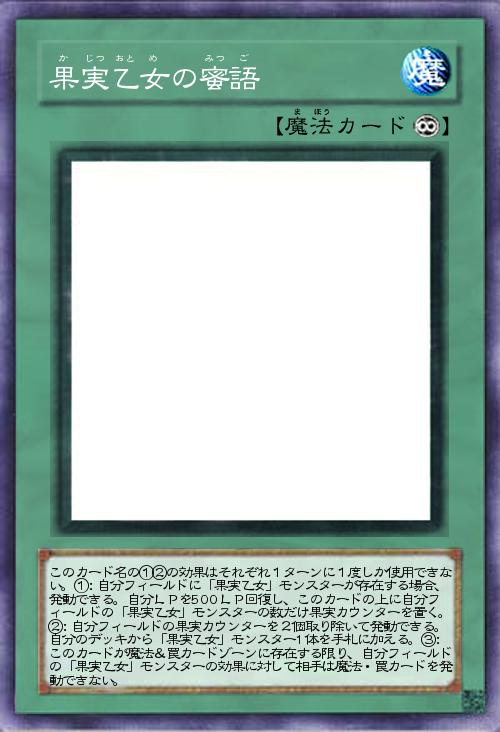 | このカード名の①②の効果はそれぞれ1ターンに1度しか使用できない。①:自分フィールドに「果実乙女」モンスターが存在する場合、発動できる。自分LPを500LP回復し、このカードの上に自分フィールドの「果実乙女」モンスターの数だけ果実カウンターを置く。②:自分フィールドの果実カウンターを2個取り除いて発動できる。自分のデッキから「果実乙女」モンスター1体を手札に加える。③:このカードが魔法&罠カードゾーンに存在する限り、自分フィールドの「果実乙女」モンスターの効果に対して相手は魔法・罠カードを発動できない。 | |||
