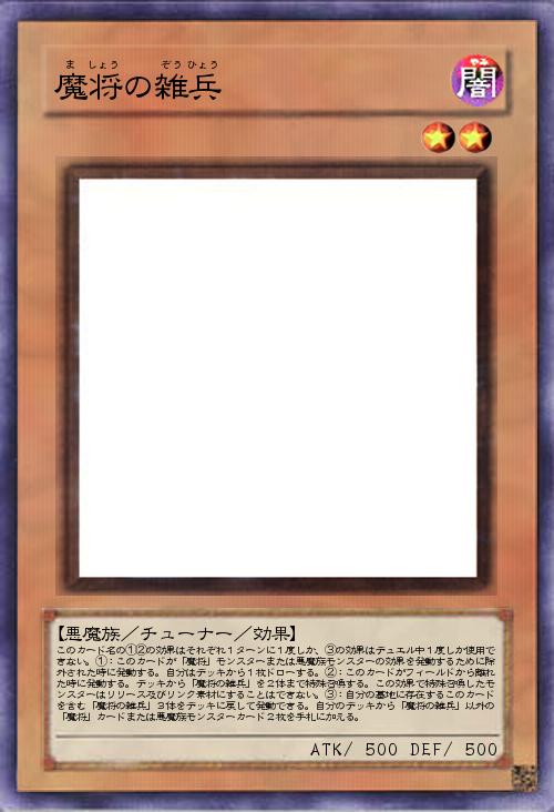 | このカード名の①②の効果はそれぞれ1ターンに1度しか、③の効果はデュエル中1度しか使用できない。①:このカードが「魔将」モンスターまたは悪魔族モンスターの効果を発動するために除外された時に発動する。自分はデッキから1枚ドローする。②:このカードがフィールドから離れた時に発動する。デッキから「魔将の雑兵」を2体まで特殊召喚する。この効果で特殊召喚したモンスターはリリース及びリンク素材にすることはできない。③:自分の墓地に存在するこのカードを含む「魔将の雑兵」3体をデッキに戻して発動できる。自分のデッキから「魔将の雑兵」以外の「魔将」カードまたは悪魔族モンスターカード2枚を手札に加える。 | |||