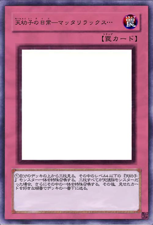 | ①自分のデッキの上から三枚見る。その中のレベル4以下の『天幼子』モンスター一体を特殊召喚する。三枚すべてが天使族モンスターだった場合、さらにその中の一体を特殊召喚する。その後、見せたカードを好きな順番でデッキの一番下に送る。 | |||