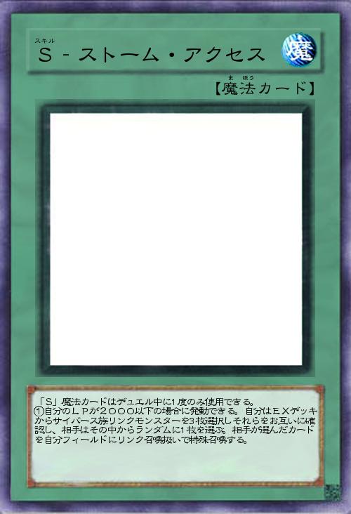 | 「S」魔法カードはデュエル中に1度のみ使用できる。 ①自分のLPが2000以下の場合に発動できる。自分はEXデッキからサイバース族リンクモンスターを3枚選択しそれらをお互いに確認し、相手はその中からランダムに1枚を選ぶ。相手が選んだカードを自分フィールドにリンク召喚扱いで特殊召喚する。 | |||