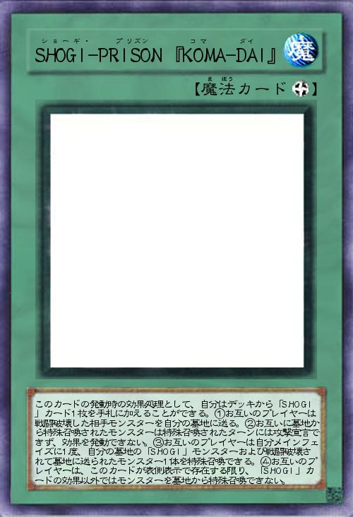 | このカードの発動時の効果処理として、自分はデッキから「SHOGI」カード1枚を手札に加えることができる。①お互いのプレイヤーは戦闘破壊した相手モンスターを自分の墓地に送る。②お互いに墓地から特殊召喚されたモンスターは特殊召喚されたターンには攻撃宣言できず、効果を発動できない。③お互いのプレイヤーは自分メインフェイズに1度、自分の墓地の「SHOGI」モンスターおよび戦闘破壊されて墓地に送られたモンスター1体を特殊召喚できる。④お互いのプレイヤーは、このカードが表側表示で存在する限り、「SHOGI」カードの効果以外ではモンスターを墓地から特殊召喚できない。 | |||