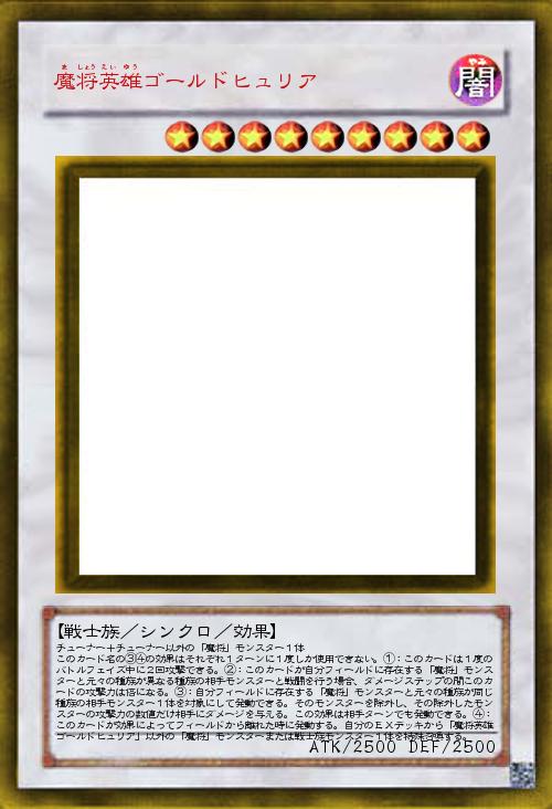 | チューナー+チューナー以外の「魔将」モンスター1体 このカード名の③④の効果はそれぞれ1ターンに1度しか使用できない。①:このカードは1度のバトルフェイズ中に2回攻撃できる。②:このカードが自分フィールドに存在する「魔将」モンスターと元々の種族が異なる種族の相手モンスターと戦闘を行う場合、ダメージステップの間このカードの攻撃力は倍になる。③:自分フィールドに存在する「魔将」モンスターと元々の種族が同じ種族の相手モンスター1体を対象にして発動できる。そのモンスターを除外し、その除外したモンスターの攻撃力の数値だけ相手にダメージを与える。この効果は相手ターンでも発動できる。④:このカードが効果によってフィールドから離れた時に発動する。自分のEXデッキから「魔将英雄ゴールドヒュリア」以外の「魔将」モンスターまたは戦士族モンスター1体を特殊召喚する。 | |||
