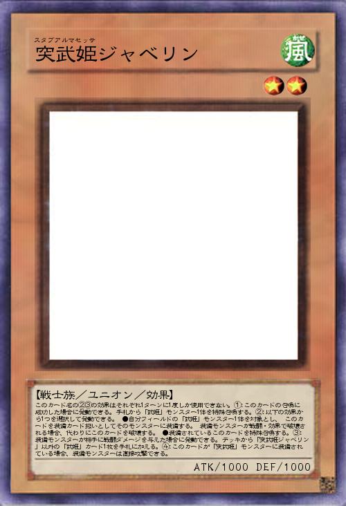 | このカード名の②③の効果はそれぞれ1ターンに1度しか使用できない。①:このカードの召喚に成功した場合に発動できる。手札から「武姫」モンスター1体を特殊召喚する。②:以下の効果から1つを選択して発動できる。 ●自分フィールドの「武姫」モンスター1体を対象とし、 このカードを装備カード扱いとしてそのモンスターに装備する。 装備モンスターが戦闘・効果で破壊される場合、代わりにこのカードを破壊する。 ●装備されているこのカードを特殊召喚する。③:装備モンスターが相手に戦闘ダメージを与えた場合に発動できる。デッキから「突武姫ジャベリン」以外の「武姫」カード1枚を手札に加える。④:このカードが「突武姫」モンスターに装備されている場合、装備モンスターは直接攻撃できる。 | |||
