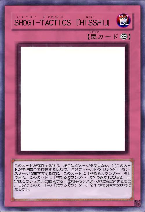 | このカードが存在する限り、相手はダメージを受けない。①このカードが表側表示で存在する状態で、自分フィールドの「SHOGI」モンスターが攻撃宣言する度に、このカードに「詰めろカウンター」を1つ置く。このカードに「詰めろカウンター」が7つ置かれた場合、自分はこのデュエルに勝利する。②相手モンスターが攻撃宣言する度に、自分はこのカードの「詰めろカウンター」を1つ取り除かなければならない。 | |||