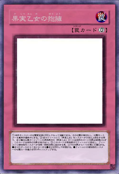 | ①:相手モンスターの攻撃宣言時に500LP払って発動できる。その攻撃を無効化し、攻撃モンスターを裏側守備表示にする。②:自分フィールドに「果実乙女」モンスターが3体以上存在する限り、自分魔法&罠カードゾーンの表側表示の「果実乙女」カードは相手のカード効果は破壊されず、このカードは相手の効果を受けない。③:このカードが表側表示でフィールドに存在し、フィールドに植物族モンスターが召喚・特殊召喚に成功する度、以下の効果から1つを選んで適応する。●自分のデッキから1枚ドローする●自分を500LP回復する。●フィールドの植物族モンスターの攻撃力・守備力を500ポイントアップする。 | |||