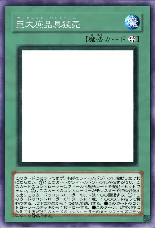 | このカードはセットできず、相手のフィールドゾーンに発動しなければならない。①:このカードがフィールドゾーンに存在する限り、このカードのコントローラーはフィールド魔法カードを発動・セットできない。②:このカードのコントローラーがモンスターを特殊召喚する度にこのカードのコントローラーのLPは100回復する。③:このカードのコントローラーが1ターンに1度、1000LP払って発動できる。以下の効果から1つ選んで適用する。●このカードのコントローラーはデッキから1枚ドローする。●このターン、通常召喚に加えて1度だけこのカードのコントローラーのメインフェイズにモンスターを召喚できる。 | |||