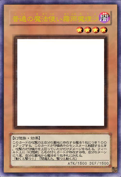 このカードの攻撃力は自分の墓地に存在する魔法1枚につき100pアップする。このカードが守備表示のモンスターと戦闘するとき、攻撃力が守備力を上回っていた分だけダメージを与える。フィールド上に「幻想郷」と名の付くカードが存在する時、自分のターンに1度、自分の墓地から魔法を1枚手札に加える。 「動くと撃つ!」「間違えた。撃つと動くだ」 |