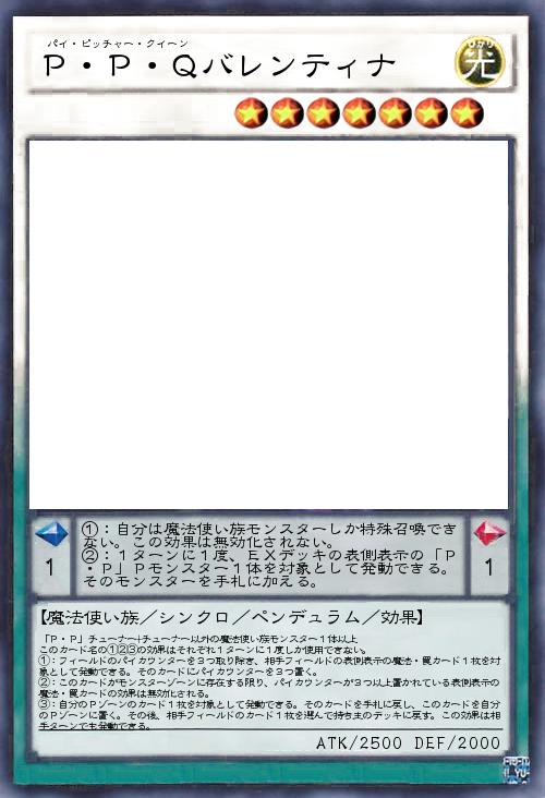 | ①:自分は魔法使い族モンスターしか特殊召喚できない。この効果は無効化されない。 ②:1ターンに1度、EXデッキの表側表示の「P・P」Pモンスター1体を対象として発動できる。そのモンスターを手札に加える。 | |||