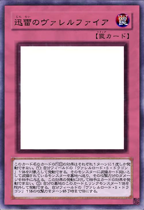 | このカード名のカードの①②の効果はそれぞれ1ターンに1度しか発動できない。①:自分フィールドの「ヴァレルロード・S・ドラゴン」1体を対象として発動できる。そのモンスターに装備カード扱いとして装備されているモンスターを墓地へ送り、その攻撃力分のダメージを相手に与える。この効果の発動に対して相手はカードの効果を発動できない。②:自分の墓地のこのカードとリンクモンスター1体を除外して発動できる。自分フィールドの「ヴァレルロード・S・ドラゴン」1体の攻撃力をターン終了時まで倍にする。 | |||
