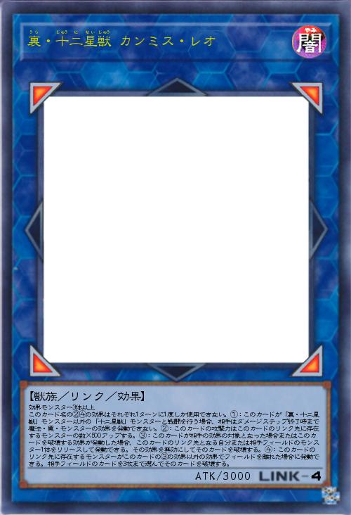 | 効果モンスター3体以上 このカード名の②④の効果はそれぞれ1ターンに1度しか使用できない。①:このカードが「裏・十二星獣」モンスター以外の「十二星獣」モンスターと戦闘を行う場合、相手はダメージステップ終了時まで魔法・罠・モンスターの効果を発動できない。②:このカードの攻撃力はこのカードのリンク先に存在するモンスターの数×500アップする。③:このカードが相手の効果の対象となった場合またはこのカードを破壊する効果が発動した場合、このカードのリンク先となる自分または相手フィールドのモンスター1体をリリースして発動できる。その効果を無効にしてそのカードを破壊する。④:このカードのリンク先に存在するモンスターがこのカードの③の効果以外の効果でフィールドを離れた場合に発動できる。相手フィールドのカードを3枚まで選んでそのカードを破壊する。 | |||