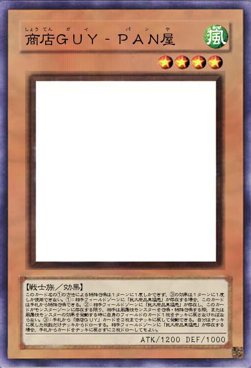 | このカード名の①の方法による特殊召喚は1ターンに1度しかできず、③の効果は1ターンに1度しか使用できない。①:相手フィールドゾーンに「巨大庶品具猛売」が存在する場合、このカードは手札から特殊召喚できる。②:相手フィールドゾーンに「巨大庶品具猛売」が存在し、このカードがモンスターゾーンに存在する限り、相手は風属性モンスターを召喚・特殊召喚する際、または風属性モンスターの効果を発動する時に自身のフィールドのカード1枚をデッキに戻さなければならない。③:手札から「商店GUY」カードを2枚までデッキに戻して発動できる。自分はデッキに戻した枚数だけデッキからドローする。相手フィールドゾーンに「巨大庶品具猛売」が存在する場合、手札からカードをデッキに戻さずに2枚ドローしてもよい。 | |||
