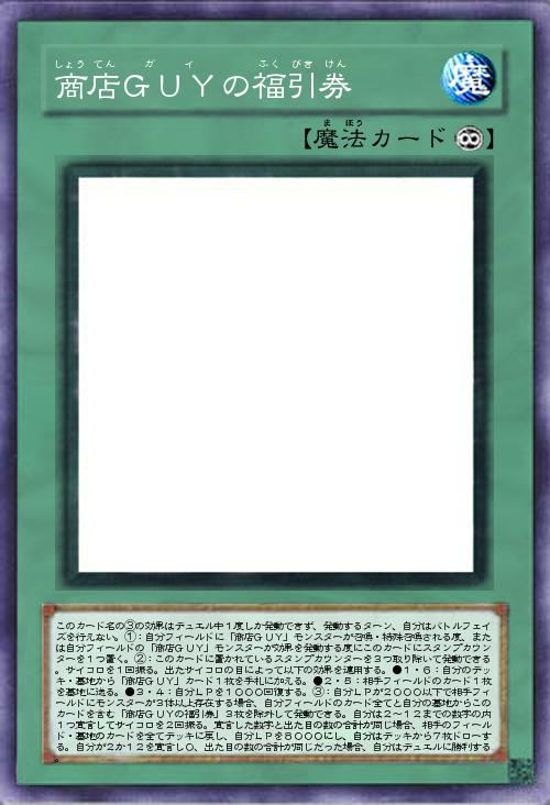 | このカード名の③の効果はデュエル中1度しか発動できず、発動するターン、自分はバトルフェイズを行えない。①:自分フィールドに「商店GUY」モンスターが召喚・特殊召喚される度、または自分フィールドの「商店GUY」モンスターが効果を発動する度にこのカードにスタンプカウンターを1つ置く。②:このカードに置かれているスタンプカウンターを3つ取り除いて発動できる。サイコロを1回振る。出たサイコロの目によって以下の効果を適用する。●1・6:自分のデッキ・墓地から「商店GUY」カード1枚を手札に加える。●2・5:相手フィールドのカード1枚を墓地に送る。●3・4:自分LPを1000回復する。③:自分LPが2000以下で相手フィールドにモンスターが3体以上存在する場合、自分フィールドのカード全てと自分の墓地からこのカードを含む「商店GUYの福引券」3枚を除外して発動できる。自分は2~12までの数字の内1つ宣言 | |||