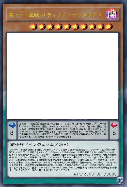 | このカード名の②③の効果はそれぞれ1ターンに1度しか使用できない。①:片方のPゾーンに「裏・十二星獣 オディウム・サジタリアス」以外の「裏・十二星獣」モンスターが存在する場合、このカードのPスケールは13になる。②:自分フィールドのカード1枚を対象に発動できる。そのカードを破壊する。この効果は相手ターンでも発動できる。③:相手フィールドのカード1枚を対象に発動できる。そのカードを破壊する。この効果は相手ターンでも発動できる。 | |||