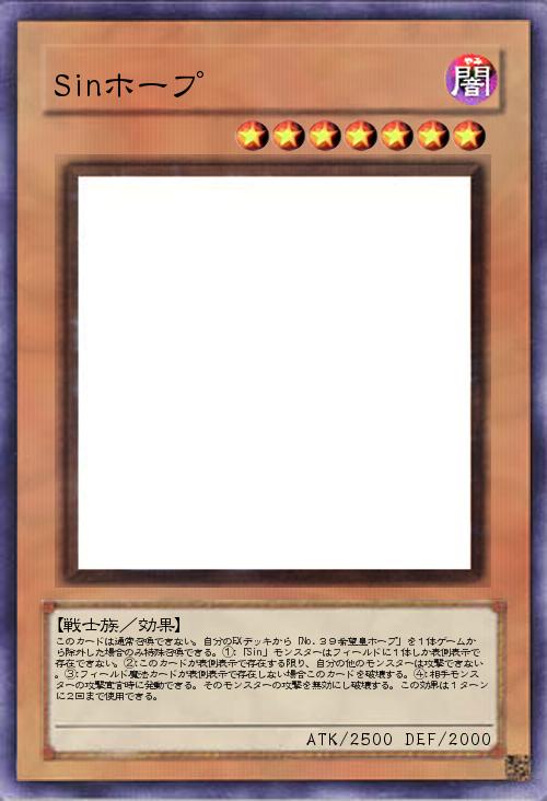 | このカードは通常召喚できない。自分のEXデッキから「No.39希望皇ホープ」を1体ゲームから除外した場合のみ特殊召喚できる。①:「Sin」モンスターはフィールドに1体しか表側表示で存在できない。②:このカードが表側表示で存在する限り、自分の他のモンスターは攻撃できない。③:フィールド魔法カードが表側表示で存在しない場合このカードを破壊する。④:相手モンスターの攻撃宣言時に発動できる。そのモンスターの攻撃を無効にし破壊する。この効果は1ターンに2回まで使用できる。 | |||