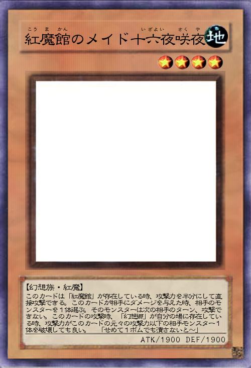 | このカードは「紅魔館」が存在している時、攻撃力を半分にして直接攻撃できる。このカードが相手にダメージを与えた時、相手のモンスターを1体選ぶ。そのモンスターは次の相手のターン、攻撃できない。このカードの攻撃時、「幻想郷」が自分の場に存在している時、攻撃力がこのカードの元々の攻撃力以下の相手モンスター1体を破壊しても良い。 「せめて1ボムでも潰さないと~」 | |||
