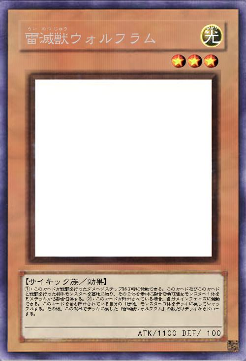 | ①:このカードが戦闘を行ったダメージステップ終了時に発動できる。このカード及びこのカードと戦闘を行った相手モンスターを墓地に送り、その2体を素材に融合召喚可能なモンスター1体をEXデッキから融合召喚する。②:このカードが除外されている場合、自分メインフェイズに発動できる。このカードを含む除外されている自分の「雷滅」モンスター3体をデッキに戻してシャッフルする。その後、この効果でデッキに戻した「雷滅獣ウォルフラム」の数だけデッキからドローする。 | |||