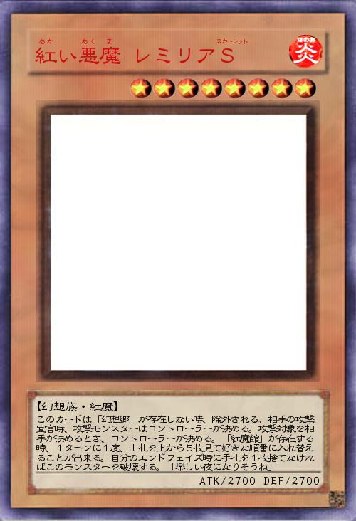 | このカードは「幻想郷」が存在しない時、除外される。相手の攻撃宣言時、攻撃モンスターはコントローラーが決める。攻撃対象を相手が決めるとき、コントローラーが決める。「紅魔館」が存在する時、1ターンに1度、山札を上から5枚見て好きな順番に入れ替えることが出来る。自分のエンドフェイズ時に手札を1枚捨てなければこのモンスターを破壊する。「楽しい夜になりそうね」 | |||