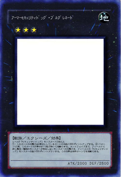 | レベル3「セキュリティドッグ」モンスター×2体以上 ①:このカードの攻撃力はX素材としているカードの枚数×300ポイントアップする。②:1ターンに1度、このカードのX素材を1つ取り除いて発動できる。エンドフェイズまで、フィールドに同じ属性・種族のモンスターが存在しないモンスターの攻撃力を、フィールドの「セキュリティドッグ」モンスターの数×500ポイントダウンする。この効果は相手ターンでも発動できる。 | |||