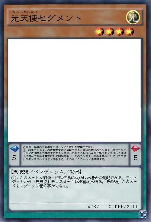| このカード名のP効果は1ターンに1度しか使用できない。 ①:相手モンスターの攻撃宣言時に発動できる。自分の墓地のモンスター及びEXデッキに表側表示で存在するPモンスターの中からレベル4の光属性モンスター2体以上を選んで効果を無効にして特殊召喚し、そのモンスターのみを素材として「光天使」Xモンスター1体をX召喚する。その後、このカードを破壊する。 | |||