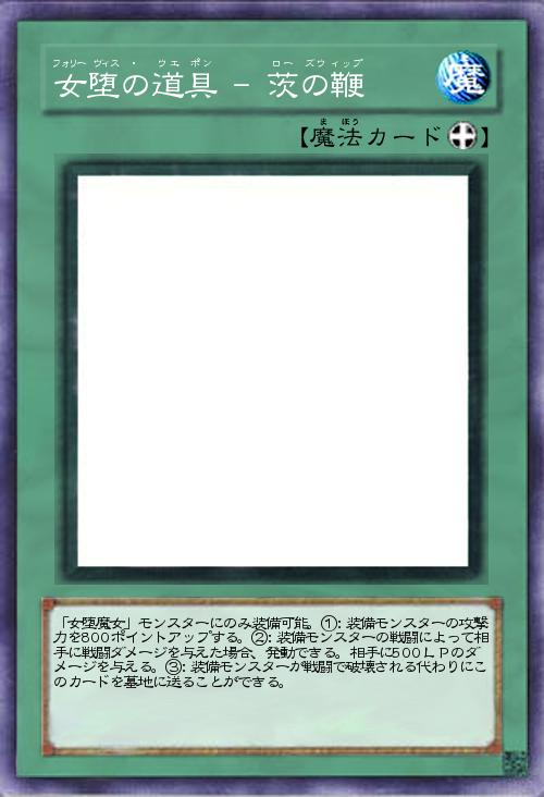 | 「女堕魔女」モンスターにのみ装備可能。①:装備モンスターの攻撃力を800ポイントアップする。②:装備モンスターの戦闘によって相手に戦闘ダメージを与えた場合、発動できる。相手に500LPのダメージを与える。③:装備モンスターが戦闘で破壊される代わりにこのカードを墓地に送ることができる。 | |||