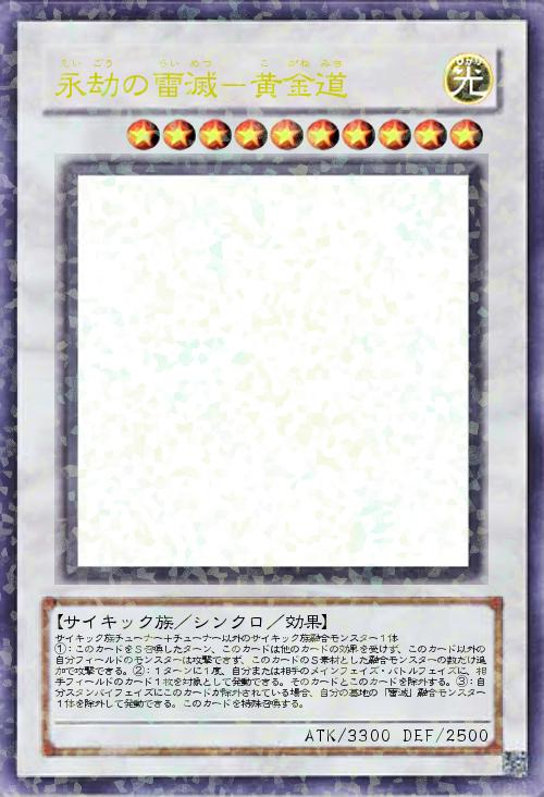 | サイキック族チューナー+チューナー以外のサイキック族融合モンスター1体 ①:このカードをS召喚したターン、このカードは他のカードの効果を受けず、このカード以外の自分フィールドのモンスターは攻撃できず、このカードのS素材とした融合モンスターの数だけ追加で攻撃できる。②:1ターンに1度、自分または相手のメインフェイズ・バトルフェイズに、相手フィールドのカード1枚を対象として発動できる。そのカードとこのカードを除外する。③:自分スタンバイフェイズにこのカードが除外されている場合、自分の墓地の「雷滅」融合モンスター1体を除外して発動できる。このカードを特殊召喚する。 | |||