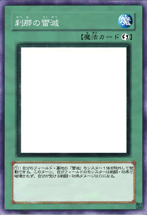 | ①:自分のフィールド・墓地の「雷滅」モンスター1体を除外して発動できる。このターン、自分フィールドのモンスターは戦闘・効果で破壊されず、自分が受ける戦闘・効果ダメージは0になる。 | |||