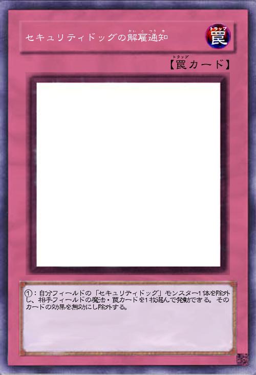 | ①:自分フィールドの「セキュリティドッグ」モンスター1体を除外し、相手フィールドの魔法・罠カードを1枚選んで発動できる。そのカードの効果を無効にし除外する。 | |||