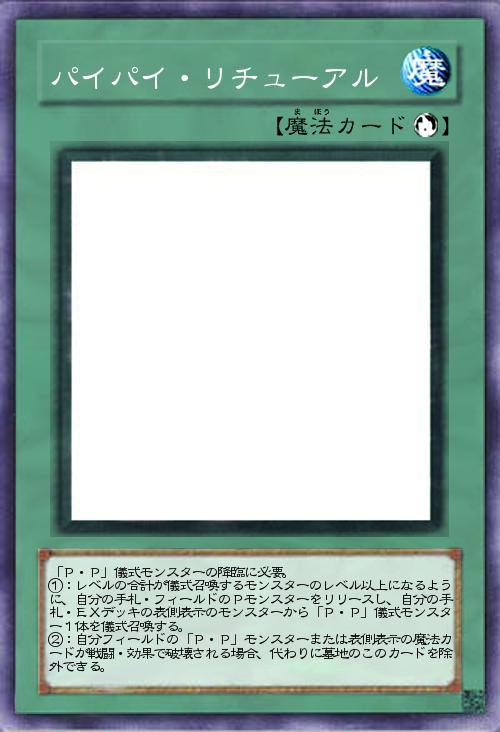 | 「P・P」儀式モンスターの降臨に必要。 ①:レベルの合計が儀式召喚するモンスターのレベル以上になるように、自分の手札・フィールドのPモンスターをリリースし、自分の手札・EXデッキの表側表示のモンスターから「P・P」儀式モンスター1体を儀式召喚する。 ②:自分フィールドの「P・P」モンスターまたは表側表示の魔法カードが戦闘・効果で破壊される場合、代わりに墓地のこのカードを除外できる。 | |||