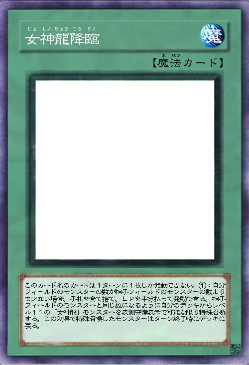 | このカード名のカードは1ターンに1枚しか発動できない。①:自分フィールドのモンスターの数が相手フィールドのモンスターの数よりも少ない場合、手札を全て捨て、LPを半分払って発動できる。相手フィールドのモンスターと同じ数になるように自分のデッキからレベル11の「女神龍」モンスターを表側守備表示で可能な限り特殊召喚する。この効果で特殊召喚したモンスターはターン終了時にデッキに戻る。 | |||
