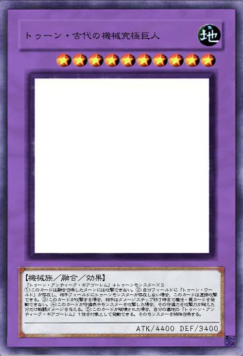 「トゥーン化した古代の機械究極巨人。カタカナ表記にすると長くなりすぎるので元の奴と同じ表記にしてあります。融合素材はトゥーン・アンティーク・ギアゴーレムとトゥーンモンスター2体、破壊されるとトゥーン・アンティーク・ギアゴーレムを蘇生します。」(2019-11-01 22:57)