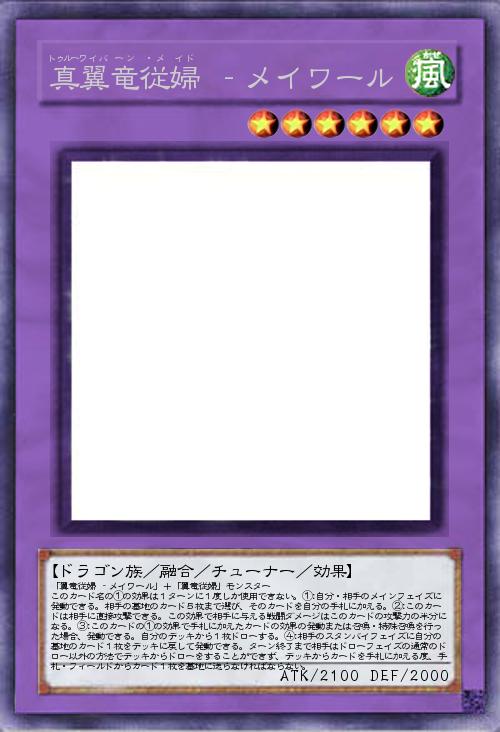 | 「翼竜従婦 ‐メイワール」+「翼竜従婦」モンスター このカード名の①の効果は1ターンに1度しか使用できない。①:自分・相手のメインフェイズに発動できる。相手の墓地のカード5枚まで選び、そのカードを自分の手札に加える。②:このカードは相手に直接攻撃できる。この効果で相手に与える戦闘ダメージはこのカードの攻撃力の半分になる。③:このカードの①の効果で手札に加えたカードの効果の発動または召喚・特殊召喚を行った場合、発動できる。自分のデッキから1枚ドローする。④:相手のスタンバイフェイズに自分の墓地のカード1枚をデッキに戻して発動できる。ターン終了まで相手はドローフェイズの通常のドロー以外の方法でデッキからドローをすることができず、デッキからカードを手札に加える度、手札・フィールドからカード1枚を墓地に送らなければならない。 | |||