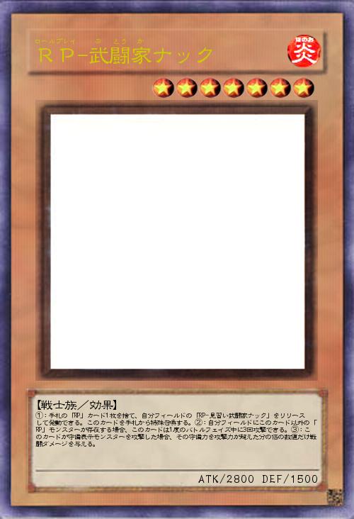 | ①:手札の「RP」カード1枚を捨て、自分フィールドの「RP-見習い武闘家ナック」をリリースして発動できる。このカードを手札から特殊召喚する。②:自分フィールドにこのカード以外の「RP」モンスターが存在する場合、このカードは1度のバトルフェイズ中に3回攻撃できる。③:このカードが守備表示モンスターを攻撃した場合、その守備力を攻撃力が超えた分の倍の数値だけ戦闘ダメージを与える。 | |||