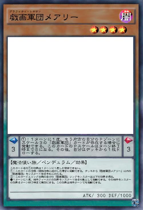 | ①:1ターンに1度、もう片方の自分のPゾーンにスケール3の「戯画軍団」カードが存在する場合に発動できる。このカードのPスケールはターン終了時まで5になる。その後、自分はデッキから1枚ドローする。 | |||