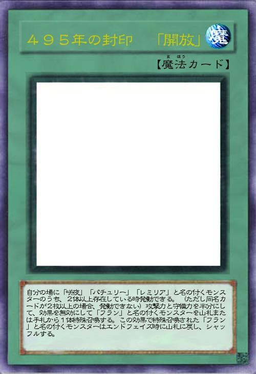 | 自分の場に「咲夜」「パチュリー」「レミリア」と名の付くモンスターのうち、2体以上存在している時発動できる。(ただし同名カードが2枚以上の場合、発動できない)攻撃力と守備力を半分にして、効果を無効にして「フラン」と名の付くモンスターを山札または手札から1体特殊召喚する。この効果で特殊召喚された「フラン」と名の付くモンスターはエンドフェイズ時に山札に戻し、シャッフルする。 | |||