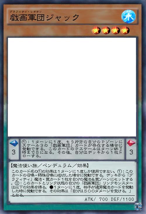| ①:1ターンに1度、もう片方の自分のPゾーンにスケール3の「戯画軍団」カードが存在する場合に発動できる。このカードのPスケールはターン終了時まで5になる。その後、自分はデッキから1枚ドローする。 | |||