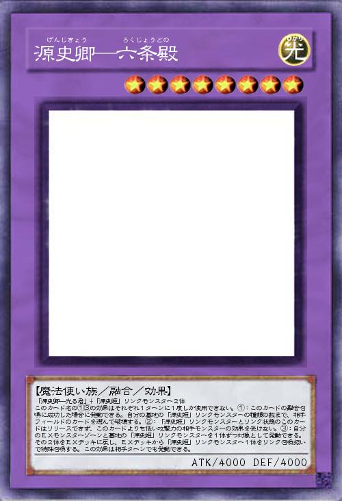 | 「源史卿─光る君」+「源史姫」リンクモンスター2体 このカード名の①③の効果はそれぞれ1ターンに1度しか使用できない。①:このカードの融合召喚に成功した場合に発動できる。自分の墓地の「源史姫」リンクモンスターの種類の数まで、相手フィールドのカードを選んで破壊する。②:「源史姫」リンクモンスターとリンク状態のこのカードはリリースできず、このカードよりも低い攻撃力の相手モンスターの効果を受けない。③:自分のEXモンスターゾーンと墓地の「源史姫」リンクモンスターを1体ずつ対象として発動できる。その2体をEXデッキに戻し、EXデッキから「源史姫」リンクモンスター1体をリンク召喚扱いで特殊召喚する。この効果は相手ターンでも発動できる。 | |||