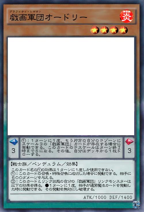 | ①:1ターンに1度、もう片方の自分のPゾーンにスケール3の「戯画軍団」カードが存在する場合に発動できる。このカードのPスケールはターン終了時まで5になる。その後、自分はデッキから1枚ドローする。 | |||