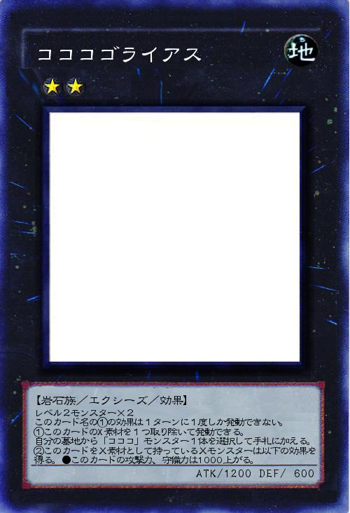 | レベル2モンスター×2 このカード名の①の効果は1ターンに1度しか発動できない。 ①このカードのX素材を1つ取り除いて発動できる。 自分の墓地から「コココ」モンスター1体を選択して手札に加える。 ②このカードをX素材として持っているXモンスターは以下の効果を得る。●このカードの攻撃力、守備力は1000上がる。 | |||