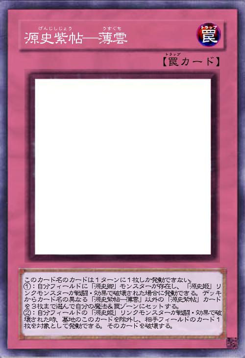 | このカード名のカードは1ターンに1枚しか発動できない。 ①:自分フィールドに「源史卿」モンスターが存在し、「源史姫」リンクモンスターが戦闘・効果で破壊された場合に発動できる。デッキからカード名の異なる「源史紫帖─薄雲」以外の「源史紫帖」カードを3枚まで選んで自分の魔法&罠ゾーンにセットする。 ②:自分フィールドの「源史姫」リンクモンスターが戦闘・効果で破壊された時、墓地のこのカードを除外し、相手フィールドのカード1枚を対象として発動できる。そのカードを破壊する。 | |||