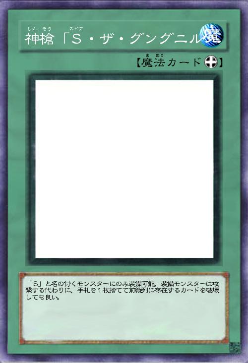 | 「S」と名の付くモンスターにのみ装備可能。装備モンスターは攻撃する代わりに、手札を1枚捨てて前縦列に存在するカードを破壊しても良い。 | |||
