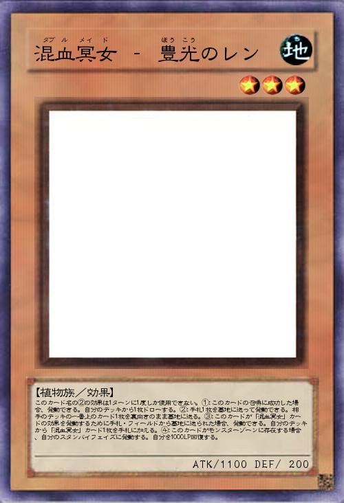| このカード名の②の効果は1ターンに1度しか使用できない。①:このカードの召喚に成功した場合、発動できる。自分のデッキから1枚ドローする。②:手札1枚を墓地に送って発動できる。相手のデッキの一番上のカード1枚を裏向きのまま墓地に送る。③:このカードが「混血冥女」カードの効果を発動するために手札・フィールドから墓地に送られた場合、発動できる。自分のデッキから「混血冥女」カード1枚を手札に加える。④:このカードがモンスターゾーンに存在する場合、自分のスタンバイフェイズに発動する。自分を1000LP回復する。 | |||
