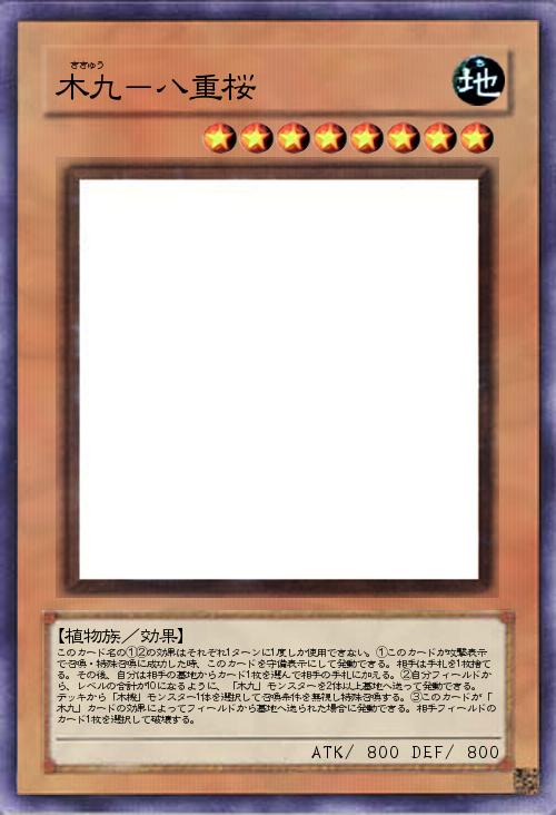 | このカード名の①②の効果はそれぞれ1ターンに1度しか使用できない。①このカードが攻撃表示で召喚・特殊召喚に成功した時、このカードを守備表示にして発動できる。相手は手札を1枚捨てる。その後、自分は相手の墓地からカード1枚を選んで相手の手札に加える。②自分フィールドから、レベルの合計が10になるように、「木九」モンスターを2体以上墓地へ送って発動できる。デッキから「木機」モンスター1体を選択して召喚条件を無視し特殊召喚する。③このカードが「木九」カードの効果によってフィールドから墓地へ送られた場合に発動できる。相手フィールドのカード1枚を選択して破壊する。 | |||