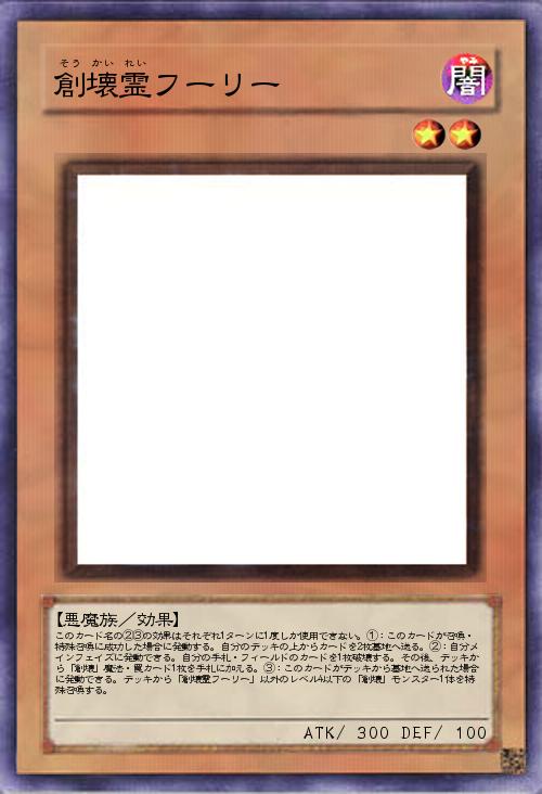| このカード名の②③の効果はそれぞれ1ターンに1度しか使用できない。①:このカードが召喚・特殊召喚に成功した場合に発動する。自分のデッキの上からカードを2枚墓地へ送る。②:自分メインフェイズに発動できる。自分の手札・フィールドのカードを1枚破壊する。その後、デッキから「創壊」魔法・罠カード1枚を手札に加える。③:このカードがデッキから墓地へ送られた場合に発動できる。デッキから「創壊霊フーリー」以外のレベル4以下の「創壊」モンスター1体を特殊召喚する。 | |||