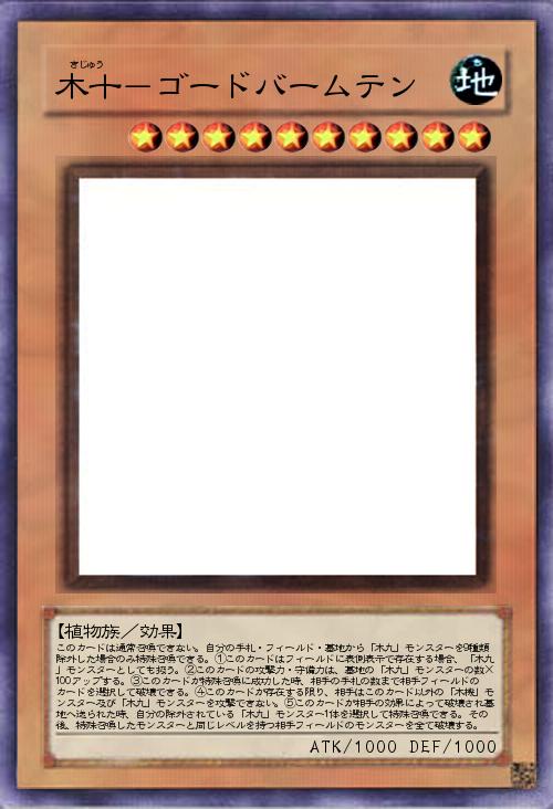 | このカードは通常召喚できない。自分の手札・フィールド・墓地から「木九」モンスターを9種類除外した場合のみ特殊召喚できる。①このカードはフィールドに表側表示で存在する場合、「木九」モンスターとしても扱う。②このカードの攻撃力・守備力は、墓地の「木九」モンスターの数×100アップする。③このカードが特殊召喚に成功した時、相手の手札の数まで相手フィールドのカードを選択して破壊できる。④このカードが存在する限り、相手はこのカード以外の「木機」モンスター及び「木九」モンスターを攻撃できない。⑤このカードが相手の効果によって破壊され墓地へ送られた時、自分の除外されている「木九」モンスター1体を選択して特殊召喚できる。その後、特殊召喚したモンスターと同じレベルを持つ相手フィールドのモンスターを全て破壊する。 | |||