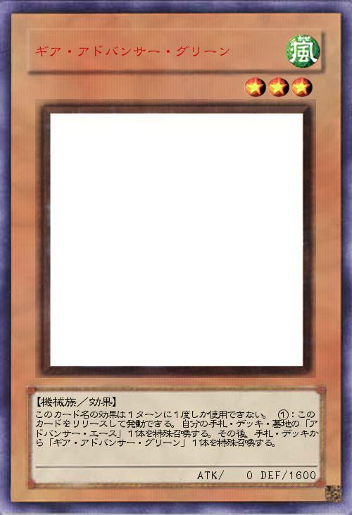| このカード名の効果は1ターンに1度しか使用できない。 ①:このカードをリリースして発動できる。自分の手札・デッキ・墓地の「アドバンサー・エース」1体を特殊召喚する。その後、手札・デッキから「ギア・アドバンサー・グリーン」1体を特殊召喚する。 | |||