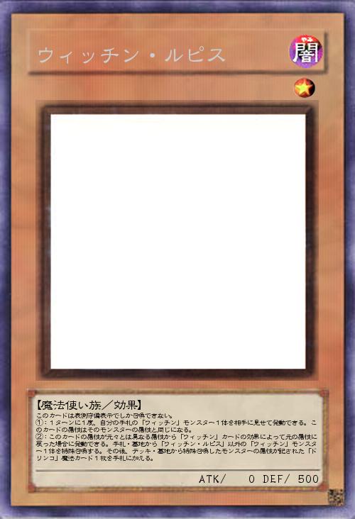 | このカードは表側守備表示でしか召喚できない。 ①:1ターンに1度、自分の手札の「ウィッチン」モンスター1体を相手に見せて発動できる。このカードの属性はそのモンスターの属性と同じになる。 ②:このカードの属性が元々とは異なる属性から「ウィッチン」カードの効果によって元の属性に戻った場合に発動できる。手札・墓地から「ウィッチン・ルピス」以外の「ウィッチン」モンスター1体を特殊召喚する。その後、デッキ・墓地から特殊召喚したモンスターの属性が記された「ドリンコ」魔法カード1枚を手札に加える。 | |||