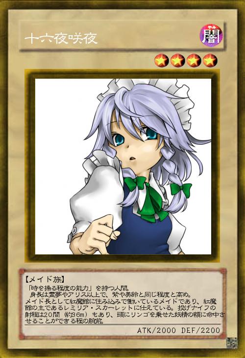 「時を操る程度の能力」を持つ人間。 身長は霊夢やアリス以上で、紫や美鈴と同じ程度と高め。 メイド長として紅魔館に住み込みで働いているメイドであり、紅魔館の主であるレミリア・スカーレットに仕えている。投げナイフの射程は20間(約36m)もあり、頭にリンゴを乗せた妖精の額に命中させることができる程の腕前。 |