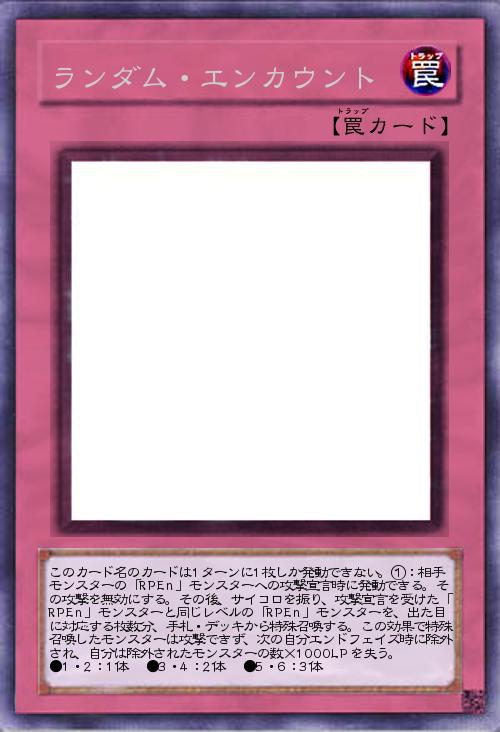 | このカード名のカードは1ターンに1枚しか発動できない。①:相手モンスターの「RPEn」モンスターへの攻撃宣言時に発動できる。その攻撃を無効にする。その後、サイコロを振り、攻撃宣言を受けた「RPEn」モンスターと同じレベルの「RPEn」モンスターを、出た目に対応する枚数分、手札・デッキから特殊召喚する。この効果で特殊召喚したモンスターは攻撃できず、次の自分エンドフェイズ時に除外され、自分は除外されたモンスターの数×1000LPを失う。 ●1・2:1体 ●3・4:2体 ●5・6:3体 | |||