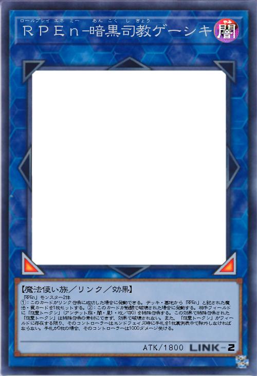 | 「RPEn」モンスター2体 ①:このカードがリンク召喚に成功した場合に発動できる。デッキ・墓地から「RPEn」と記された魔法・罠カードを1枚セットする。②:このカードが戦闘で破壊された場合に発動する。相手フィールドに「怨霊トークン」(アンデット族・闇・星1・攻/守0)を特殊召喚する。この効果で特殊召喚された「怨霊トークン」は特殊召喚の素材にできず、効果で破壊されない。また、「怨霊トークン」がフィールドに存在する限り、そのコントローラーはエンドフェイズ時に手札を1枚裏側表示で除外しなければならない。手札が0枚の場合、そのコントローラーは1000ダメージ受ける。 | |||