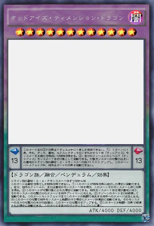 | このカード名の②P効果は1デュエル中に1度しか使用できない。①:1ターンに1度、手札、デッキ、墓地、エクストラデッキのいずれかから1体「オッドアイズ」モンスターを正規の召喚扱いで特殊召喚する。②:自分のフィールドのレベル7「オッドアイズ」モンスター1体を対象として発動できる。対象モンスターの攻撃力は互いの墓地のドラゴン族の融合・S・Xモンスターの数×1000アップし、このターンバトルフェイズ中、相手はカードの効果を発動できない。 | |||